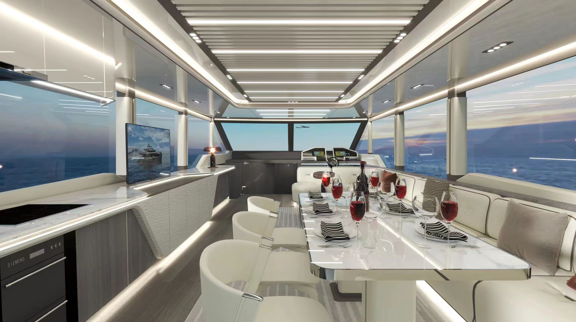 一體化定制的豪華商務沙龍,空間最大化,大窗戶審美設計同時也提升了甲板和內(nèi)部整體空間的通透性。私人定制廚房,鮮美海鮮,精致點心,多樣化烹飪方案,滿足各類商務招待。觥籌交錯,暢飲一杯,可獨飲,可歡聚,私人與派對的多重空間,自在選擇,自如品鑒。