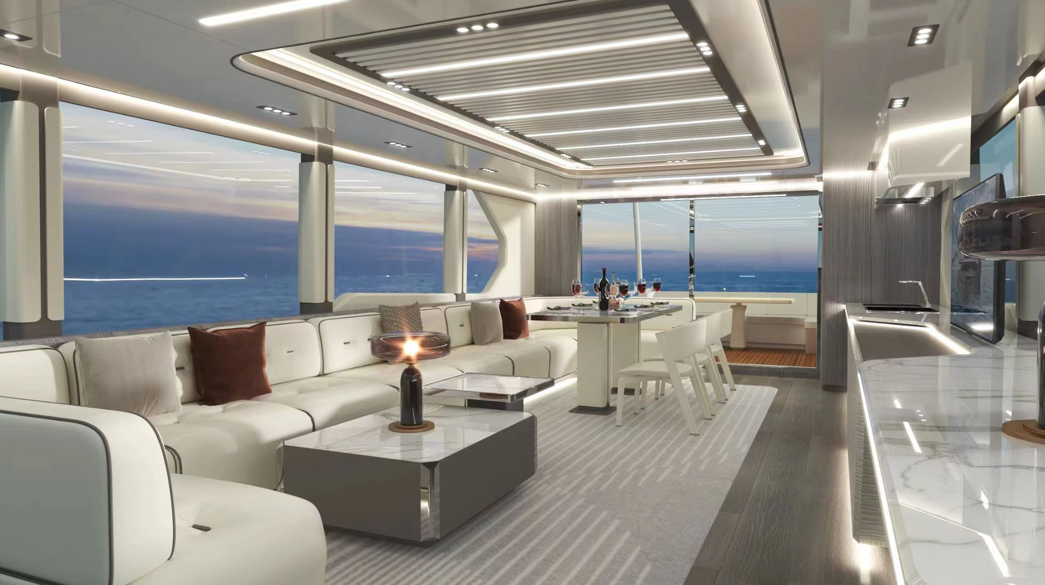 一體化定制的豪華商務沙龍,空間最大化,大窗戶審美設計同時也提升了甲板和內(nèi)部整體空間的通透性。私人定制廚房,鮮美海鮮,精致點心,多樣化烹飪方案,滿足各類商務招待。觥籌交錯,暢飲一杯,可獨飲,可歡聚,私人與派對的多重空間,自在選擇,自如品鑒。